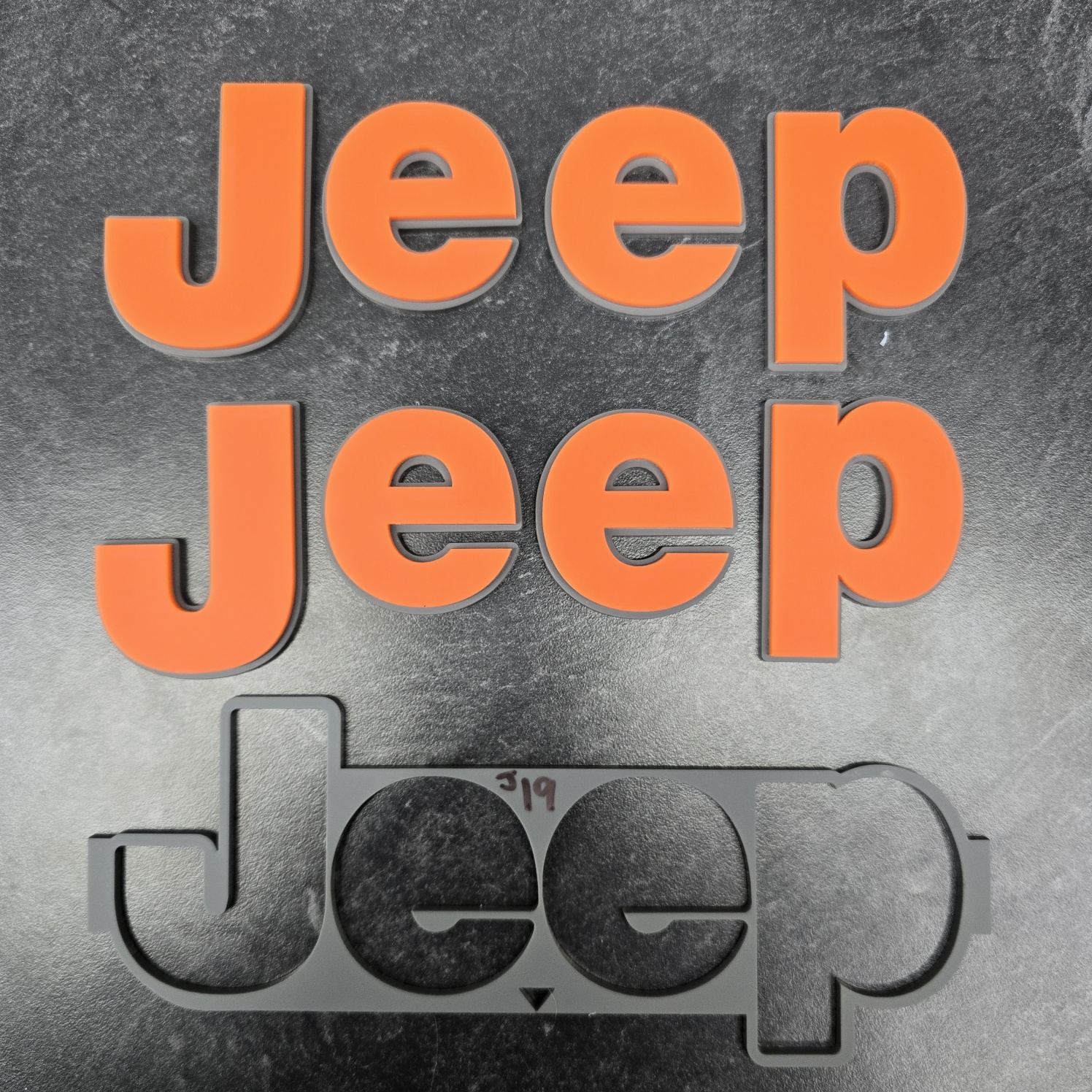 These emblems are custom made in our shop, from 1/8″ cast acrylic, and are laser cut. Final letters stacked will end up around 1/4″ thick. These are 7″ wide. Outlines are approx 1/16″. They have 3m Double sided tape, also laser cut for a perfect fit, installed on the back.