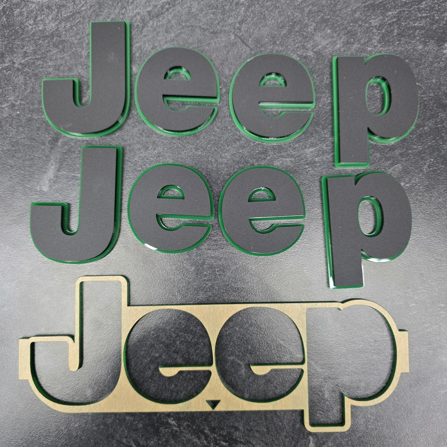 These emblems are custom made in our shop, from 1/8″ cast acrylic, and are laser cut. Final letters stacked will end up around 1/4″ thick. These are 7″ wide. Outlines are approx 1/16″. They have 3m Double sided tape, also laser cut for a perfect fit, installed on the back.