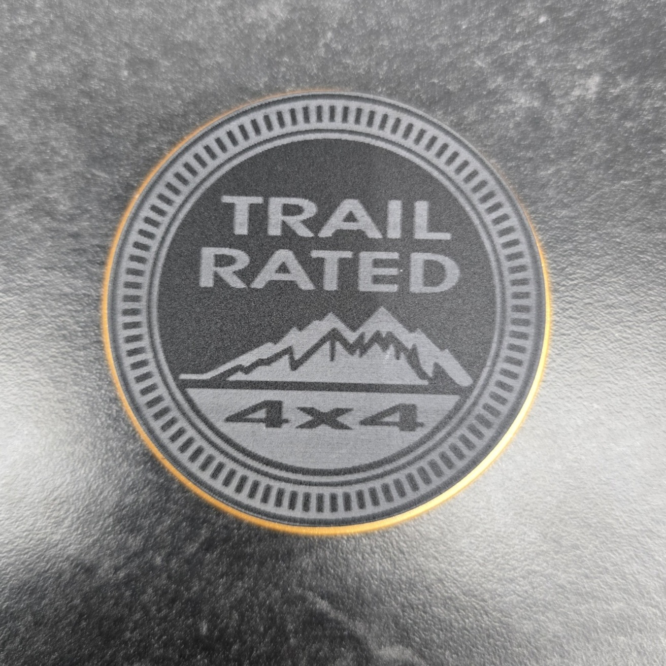 These are 1 or two color, engraved, Trail Rated badges. They are made from 2 layers of 1/8″ acrylic, stacked, and made to fit in the stock indented location.