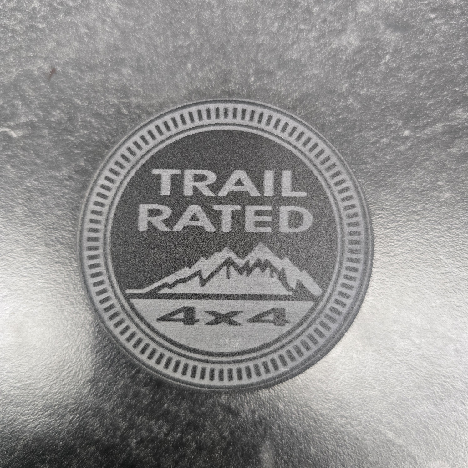 These are 1 or two color, engraved, Trail Rated badges. They are made from 2 layers of 1/8″ acrylic, stacked, and made to fit in the stock indented location.