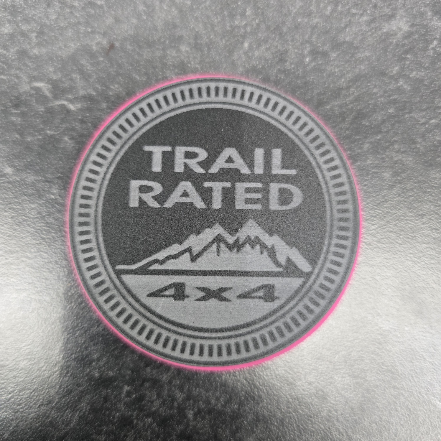 These are 1 or two color, engraved, Trail Rated badges. They are made from 2 layers of 1/8″ acrylic, stacked, and made to fit in the stock indented location.